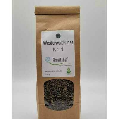 Die Westerwald-Linse Nr. 1 (Bio) ist eine mittelgroße dunkelgrüne marmorierte Linse. Sie besitzt einen intensiven Geschmack und ist festkochend, d.h. sie verkocht nicht mehlig und zerfällt nicht.